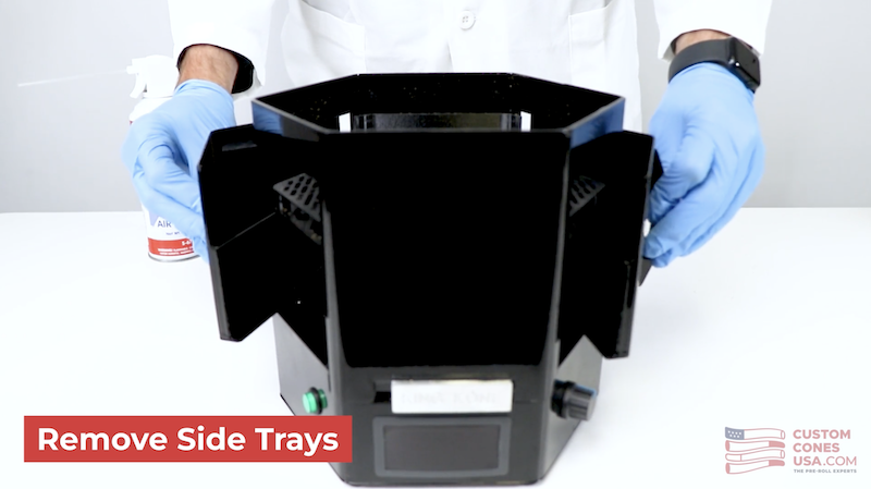One of the unique features of the King Kone is the addition of the collector trays on the side of the machine that are there to catch any flower that may fall out or through during packing. The side trays are made from powder-coated stainless steel. To clean these, grab a cloth or brush and use up to 95% isopropyl alcohol to clean any buildup or residue from all the surfaces and crevices.