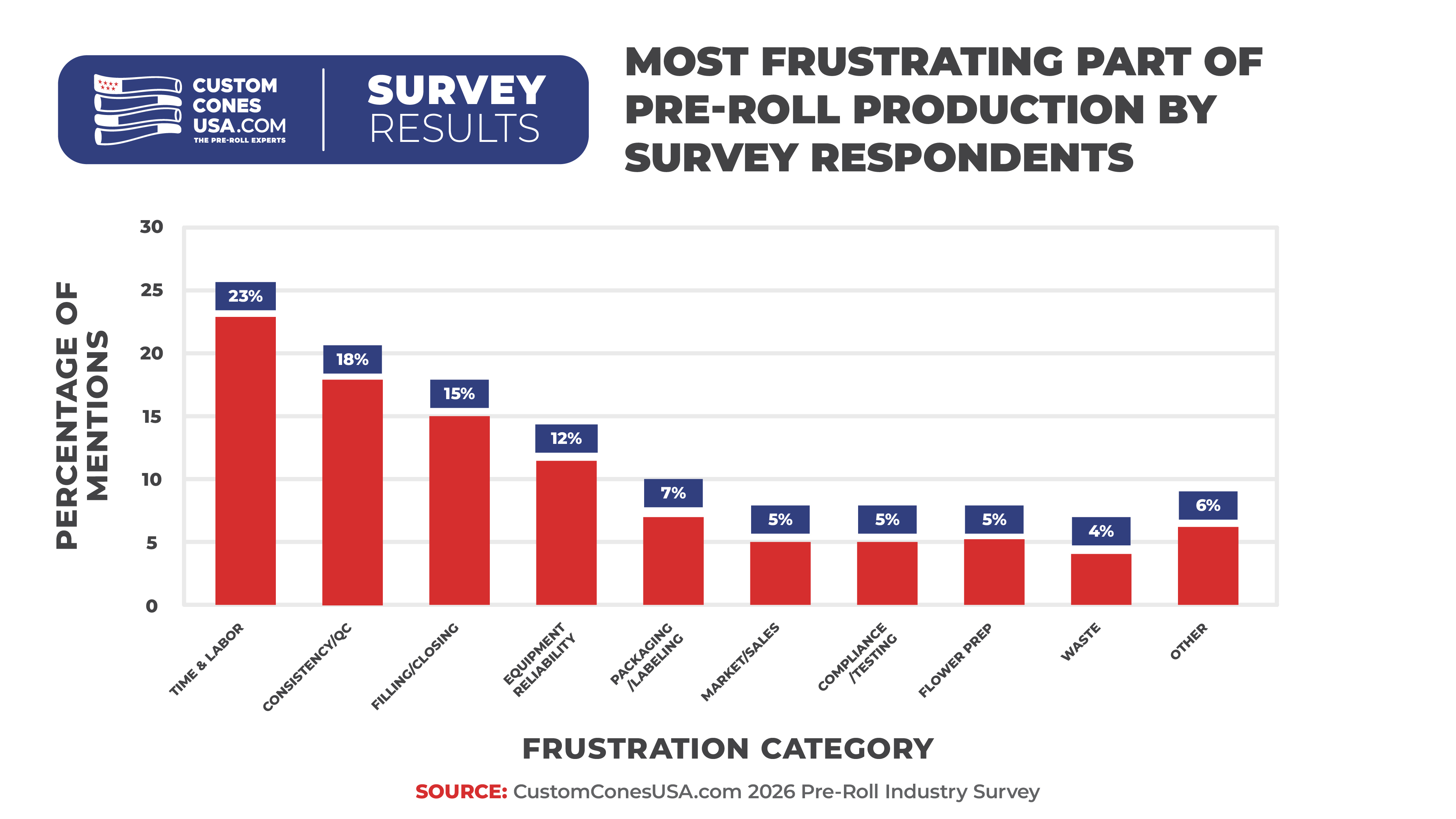 When asked directly what the most frustrating part of pre-roll manufacturing is, 28% mentioned time and labor, with 22% citing consistency and 18% saying filling/closing.