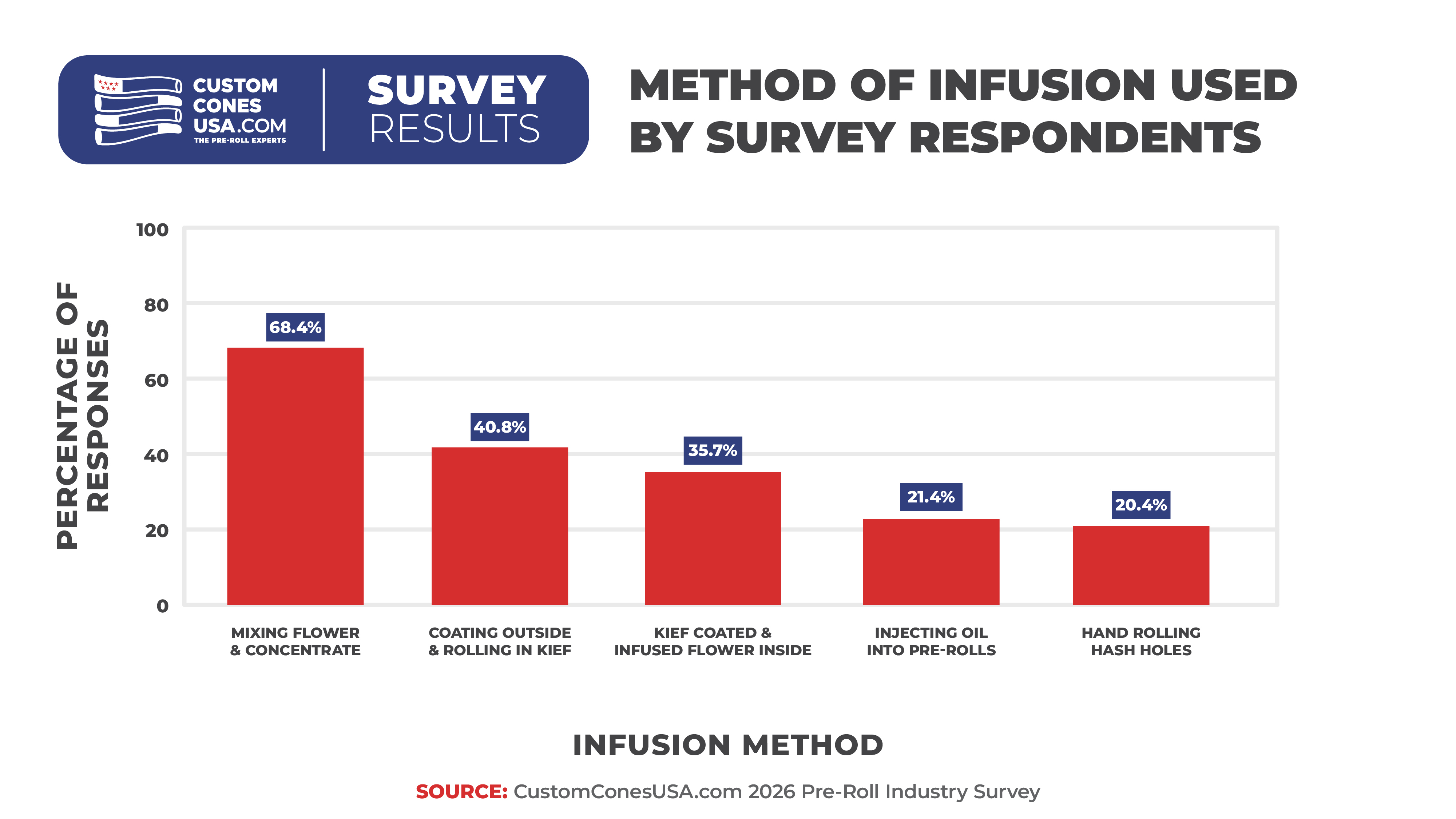 More specifically, 68.4% mix their flower and concentrate prior to packing while 21.4% inject oil into their pre-rolls and 20.4% hand-roll hash hole-style pre-rolls. Another 35.7% combine kief and flower inside the cones while 40.8% coat the outside and rolling it in kief.