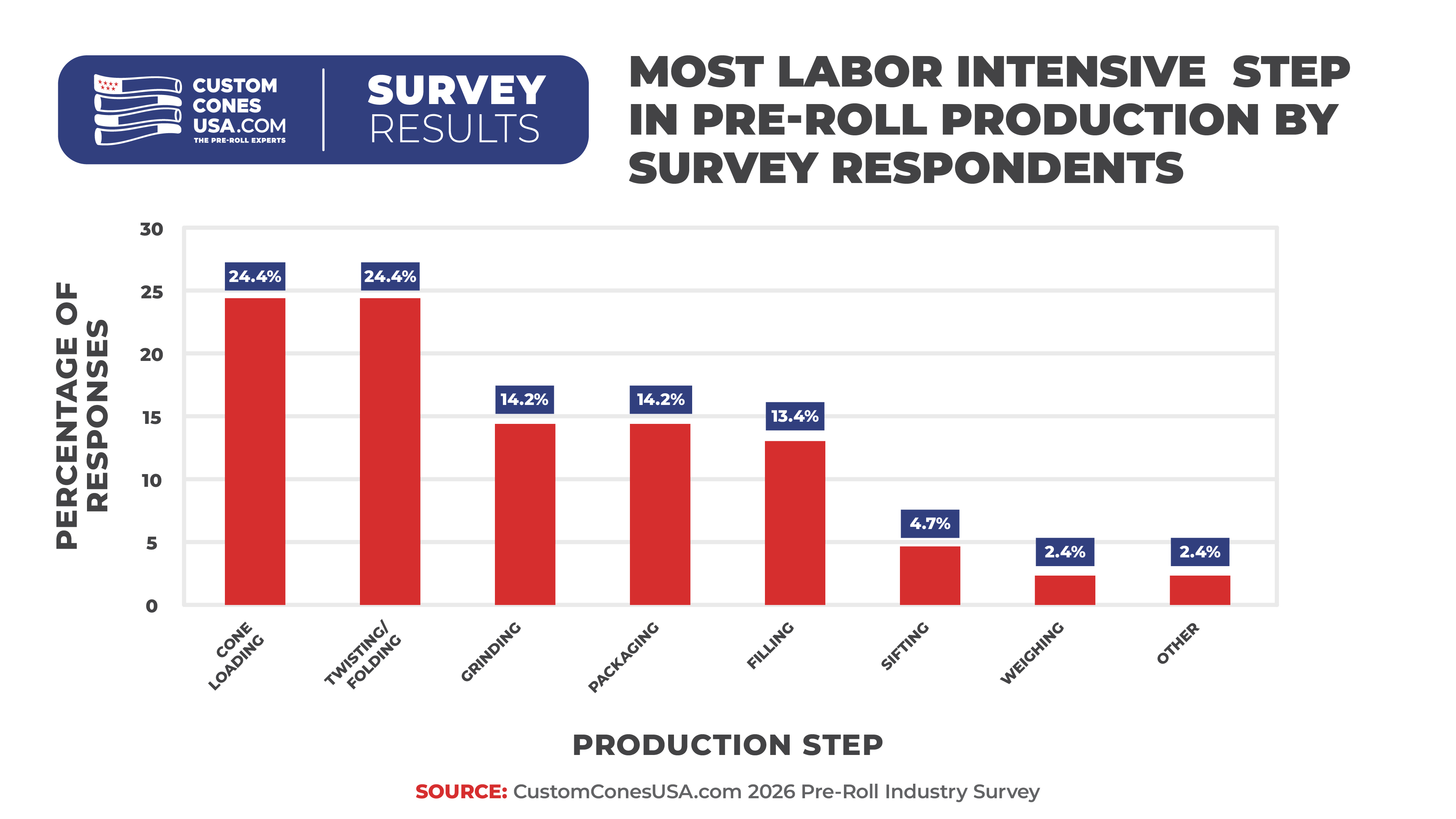 Traditionally, the most time-consuming part of pre-roll production has been closing cones, but this year, we have a tie at the top. While 24.4% of respondents said twisting/folding - the same percentage as in 2024 – it was joined this year with the same percentage saying “cone loading,” up from 22% in our last survey.