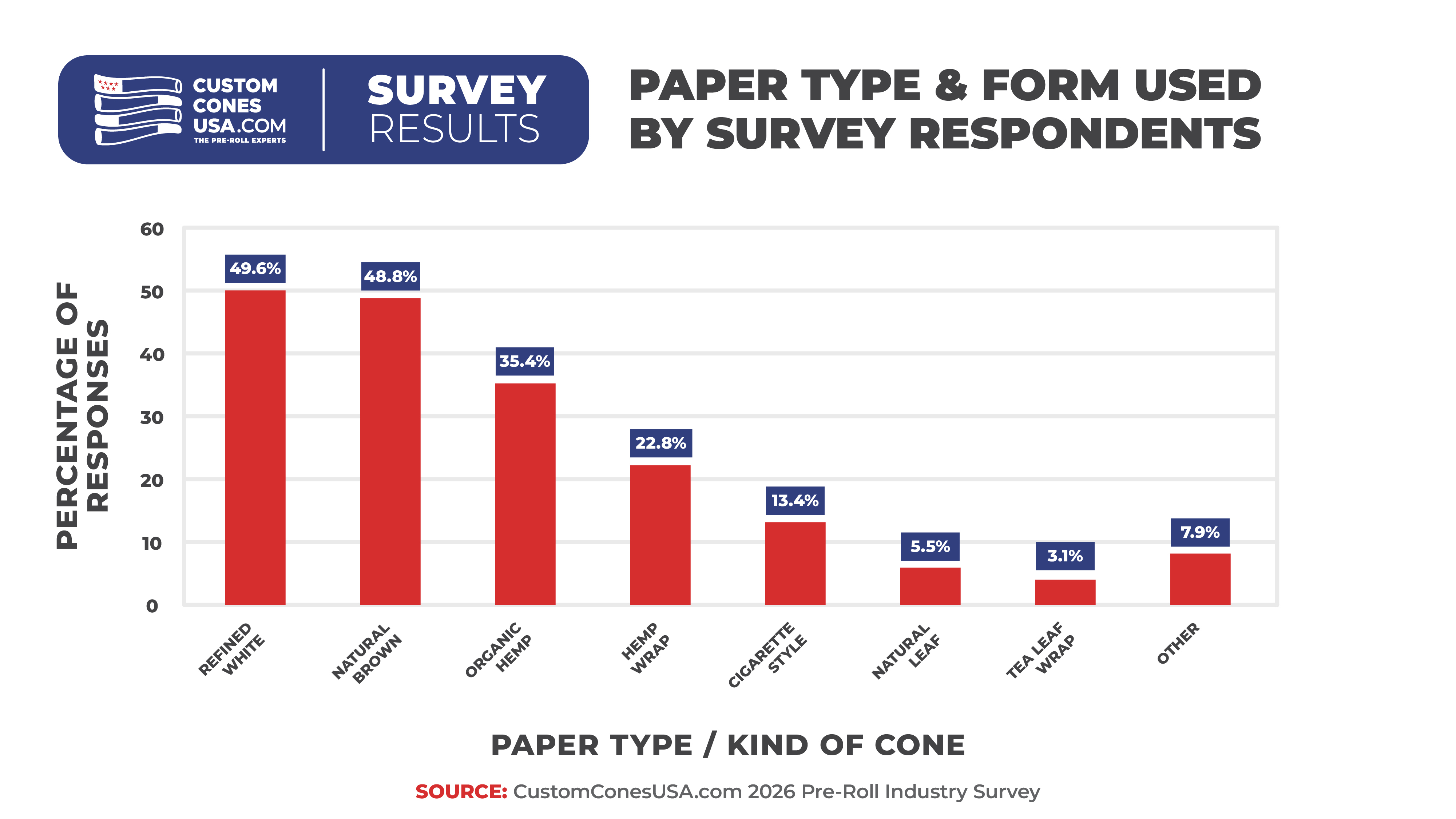 Once again, refined white paper is the most popular paper used in the pre-roll industry, with 49.6% of our respondents offering a refined white option. Natural Brown paper remains very popular, coming in second with 48.8%, followed by organic hemp paper at 35.4%.